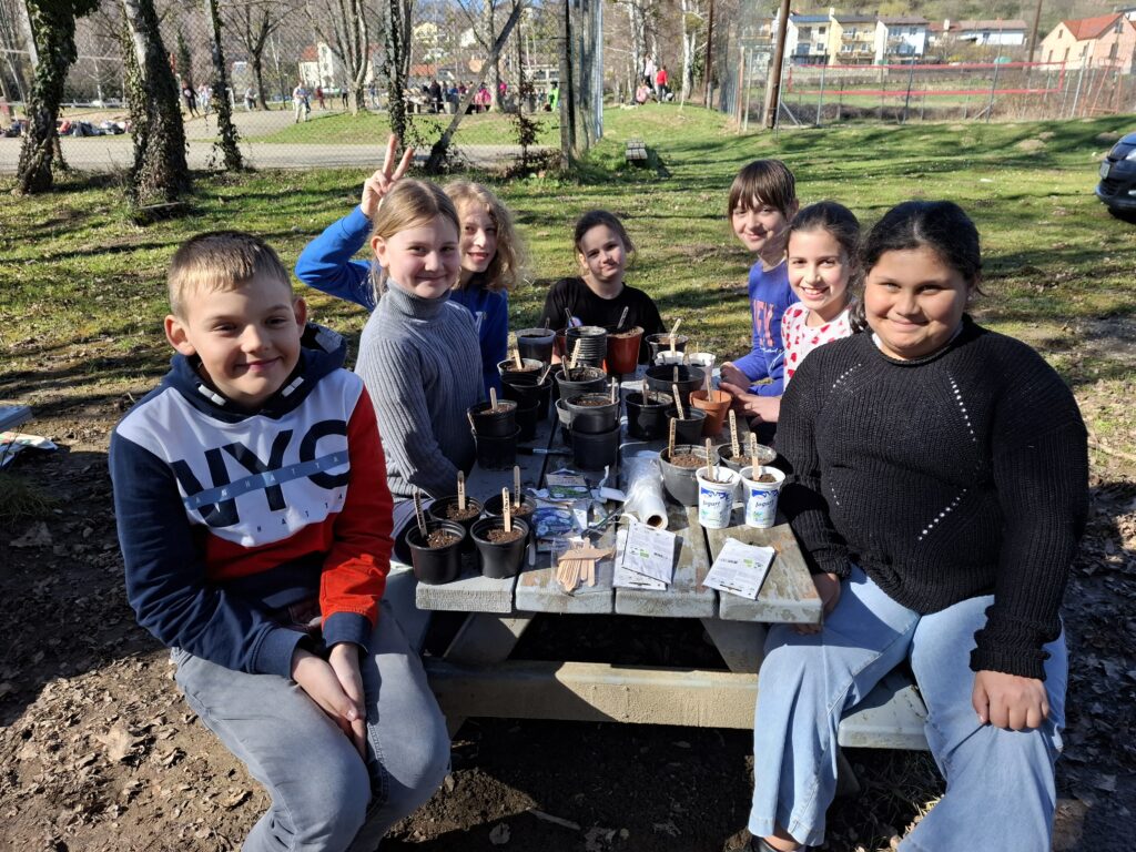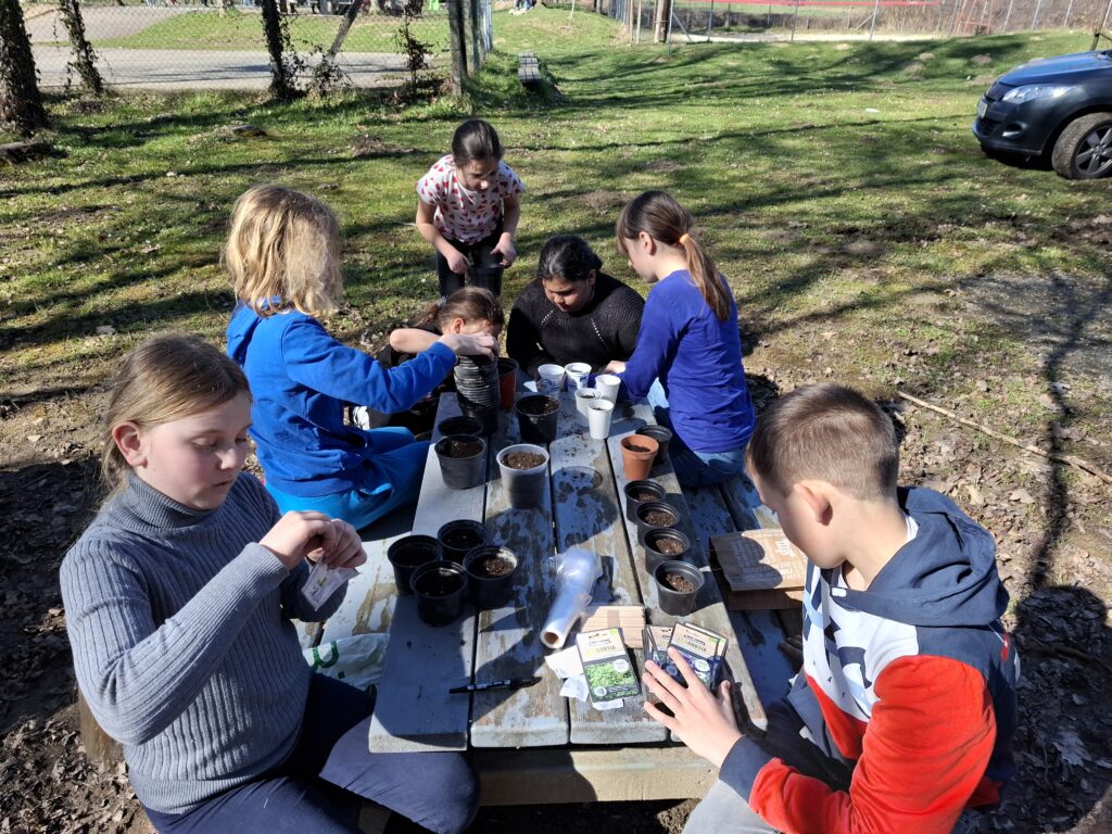 V lončne smo dali zemljo in semena. Na sladoledne palčke smo s flumastrom pripisali imena posajenih rastlin in jih odnesli domov, kjer jih bomo zalili in opazovali pri rasti.